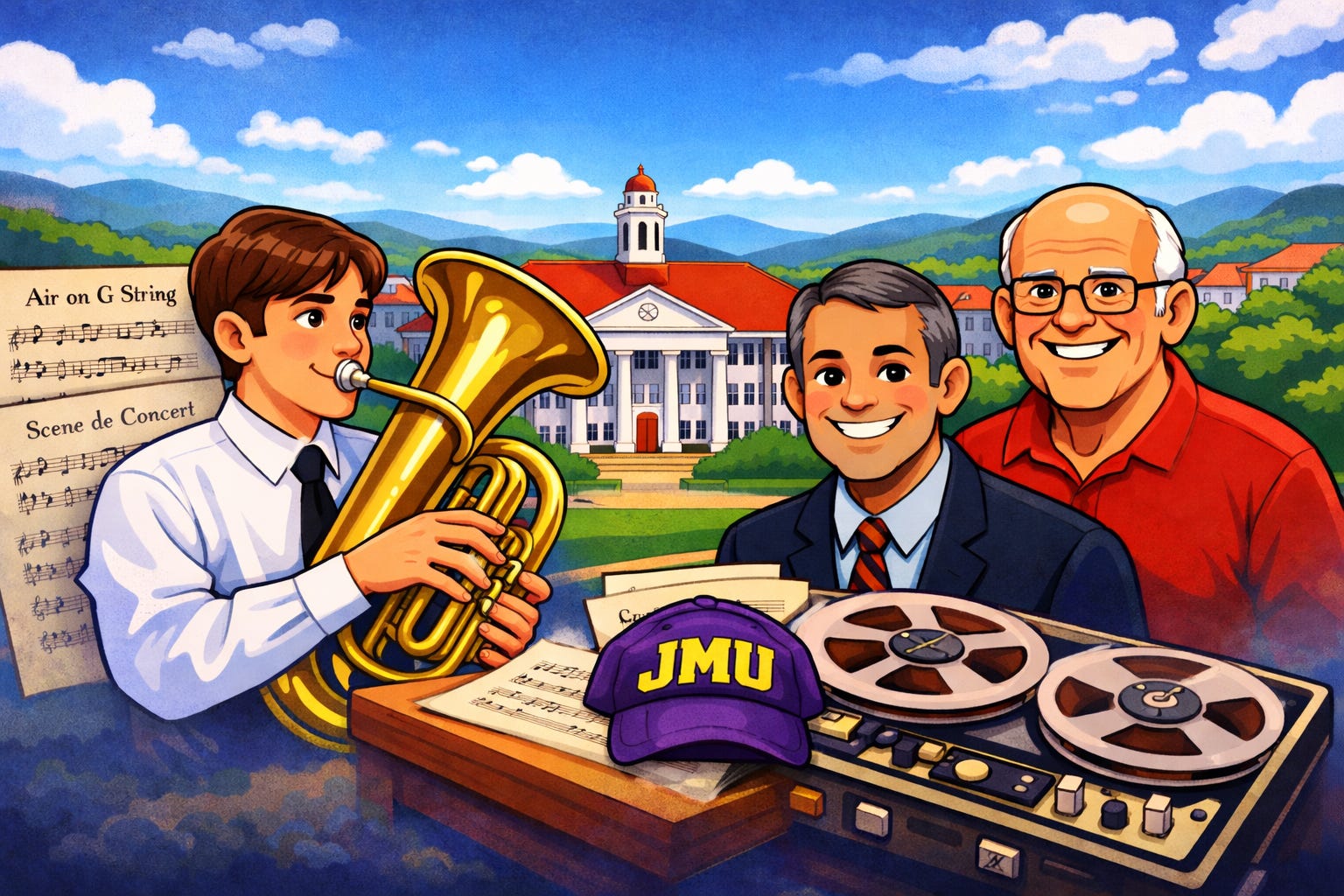 Mr. Estock told me that my baritone playing had tipped the scales. My academic record wasn’t good enough for JMU, but the music department (Dr. Estock) had gone to bat for me.